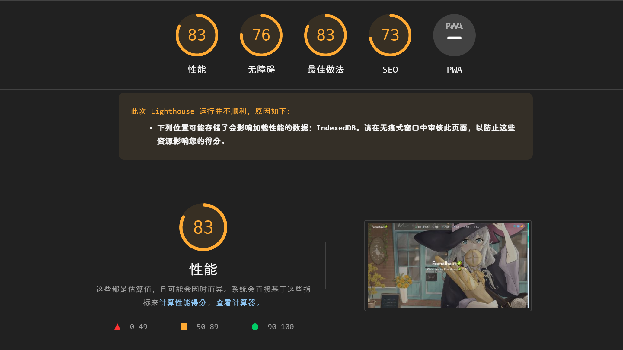 性能评分的分值区间是0到100,如果出现0分,通常是在运行 Lighthouse 时发生了错误,满分100分代表了网站已经达到了98分位值的数据,而50分则是75分位值的数据。