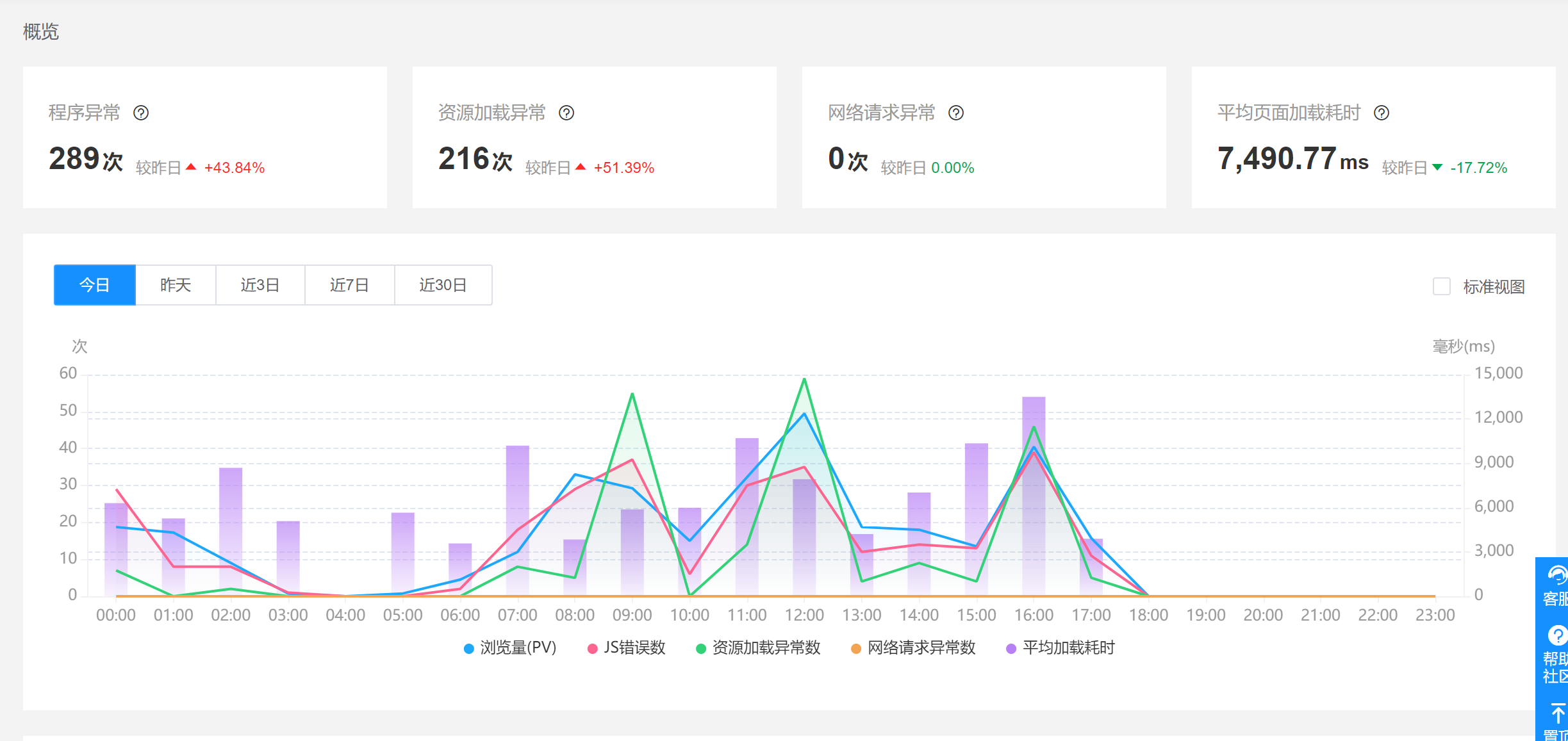 实时监控网站发生的程序错误、网络请求异常、资源加载异常等潜在问题,精准采集错误上报的页面、错误发生时间、UA等详细的用户设备数据,帮您快速定位异常,提高debug效率。