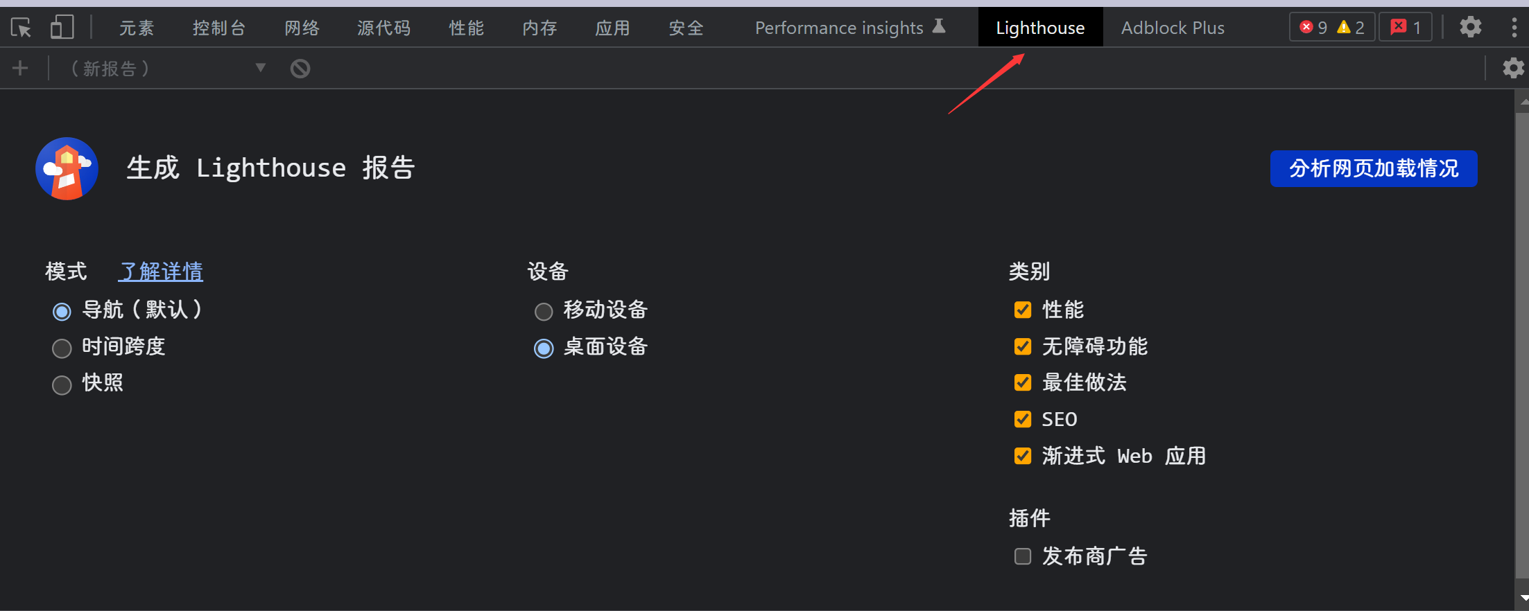 在高版本(应该是 >= 60)的 Chrome 浏览器中,Lighthouse 已经直接集成到了调试工具 DevTools 中了,因此不需要进行任何安装或下载。按 F12 打开开发者工具,可以看到在 console、security 等选项后面有一个 Audits (安装了lighthouse插件或者是高版本的谷歌浏览器可能显示的是 lighthouse)选项,选择该选项,然后点击 generate report 即可。